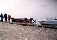 At about noon, as we were making our way up the coast, we were invited in to a camp - there are all kinds of camps along the shore here. People leave Taloyoak for days at a time and come up and enjoy the hunting and fishing and whatnot. We were invited in over the radio. We came in and had coffee and bannock. Bannock is like a bread, made in a frying pan, about 1-2 inches thick, and it's excellent. We had our first taste of seal meat, which was strong but not unpleasant. We quite enjoyed that. And then we headed out up the coast again.